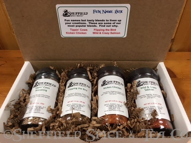 Fun names but tasty blends to liven up your creations. These are some of our most popular blends. Find out why. Here’s what we have in this set. Tippin’ Cows Steak Seasoning, Flipping the Bird, Kicken’ Chicken and Wild & Crazy Salmon.